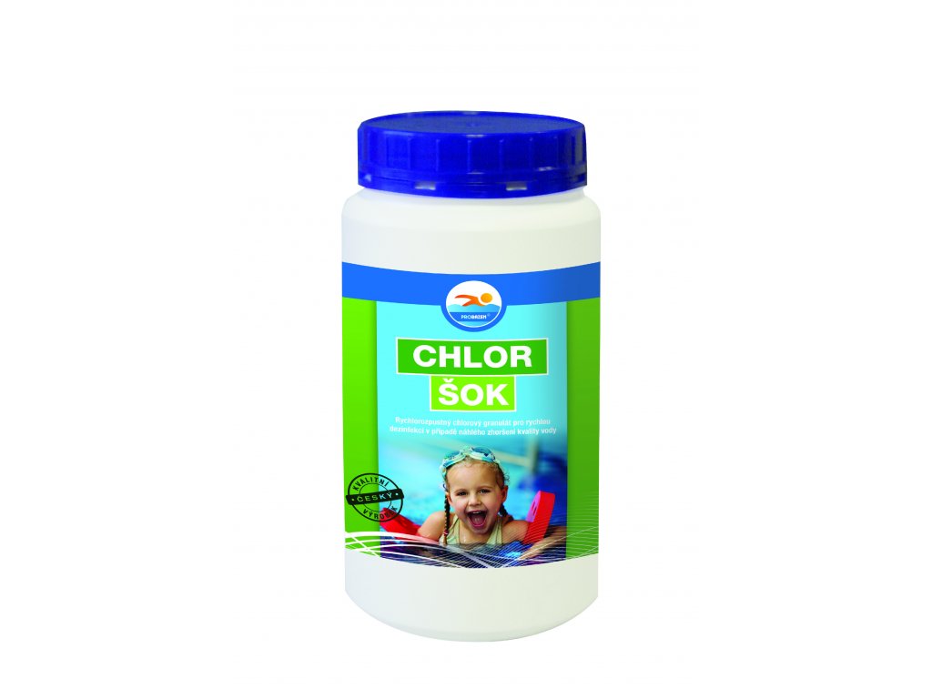 Použití: Před aplikací přípravku zkontrolujte pH vody příslušným testerem, nastavte hodnotu pH na 6,8-7,6pomocí přípravků pH MINUS nebo pH PLUS. Dávkujte 90 g přípravku CHLOR ŠOK na 10 m3 vody v bazénu, podle míry znečištění je možné tuto dávku snížit nebo zvýšit. Přípravek se pomalu nasype do skimmeru při zapnuté cirkulaci vody tak, aby byl granulát plynule vtahován do cirkulačního systému. Odměřenou dávku je možné také předem rozpustit ve vodě v plastové nádobě a vzniklou suspenzi pak pomalu vlít do bazénu. V průběhu šokové úpravy vody není vhodné používat bazén ke koupání z důvodu vysoké koncentrace chloru, to je možné obnovit až po jejím poklesu na max. 0,5 mg/l. Po vyčištění vody je možné opět nasadit přípravky pro úpravu vody CHLOR TABLETY, KOMBI TABLETY nebo MULTI TABLETY 5v1.