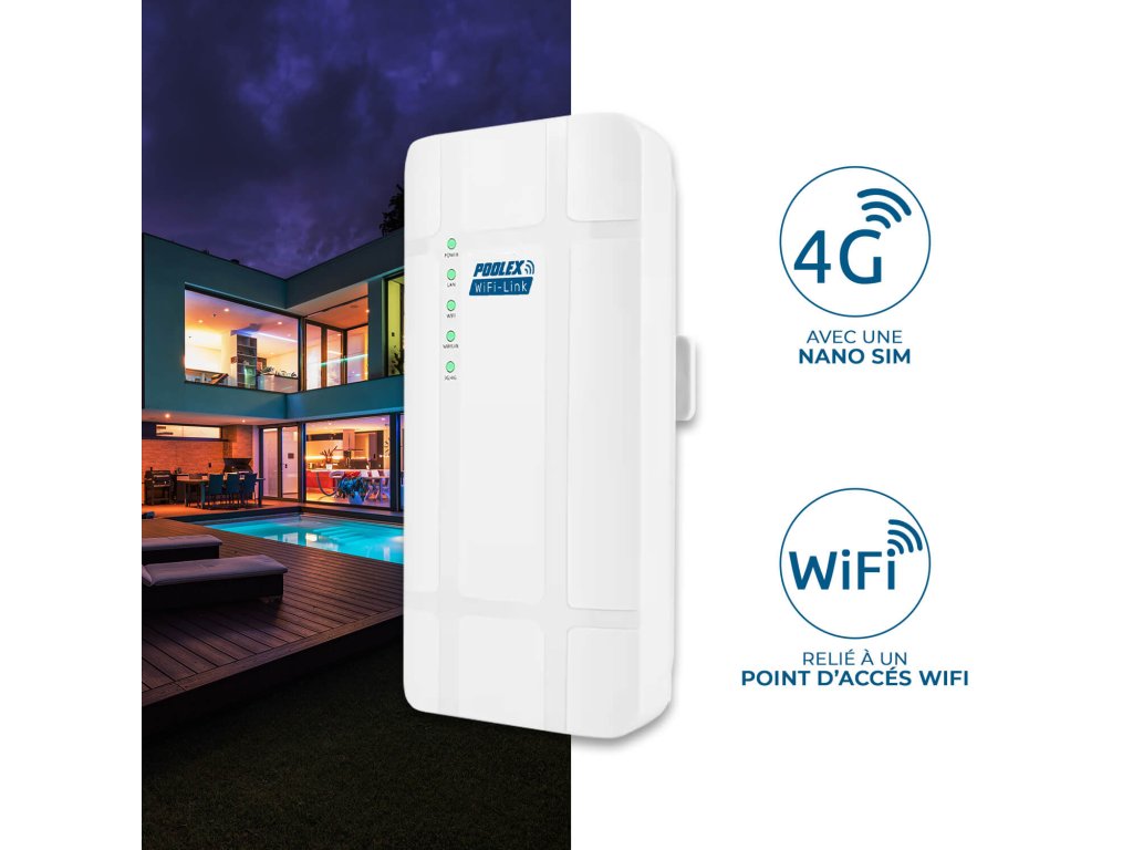 Využijte sílu 4G vložením Nano-SIM karty do Poolex WiFi-Link nebo ji připojte k vašemu internetovému boxu či WiFi opakovači pomocí kabelu. Získáte tak přístupový bod WiFi a vysoce kvalitní připojení po celém vašem bazénu. Dva režimy připojení zajišťující bezproblémovou WiFi kolem vašeho bazénu.