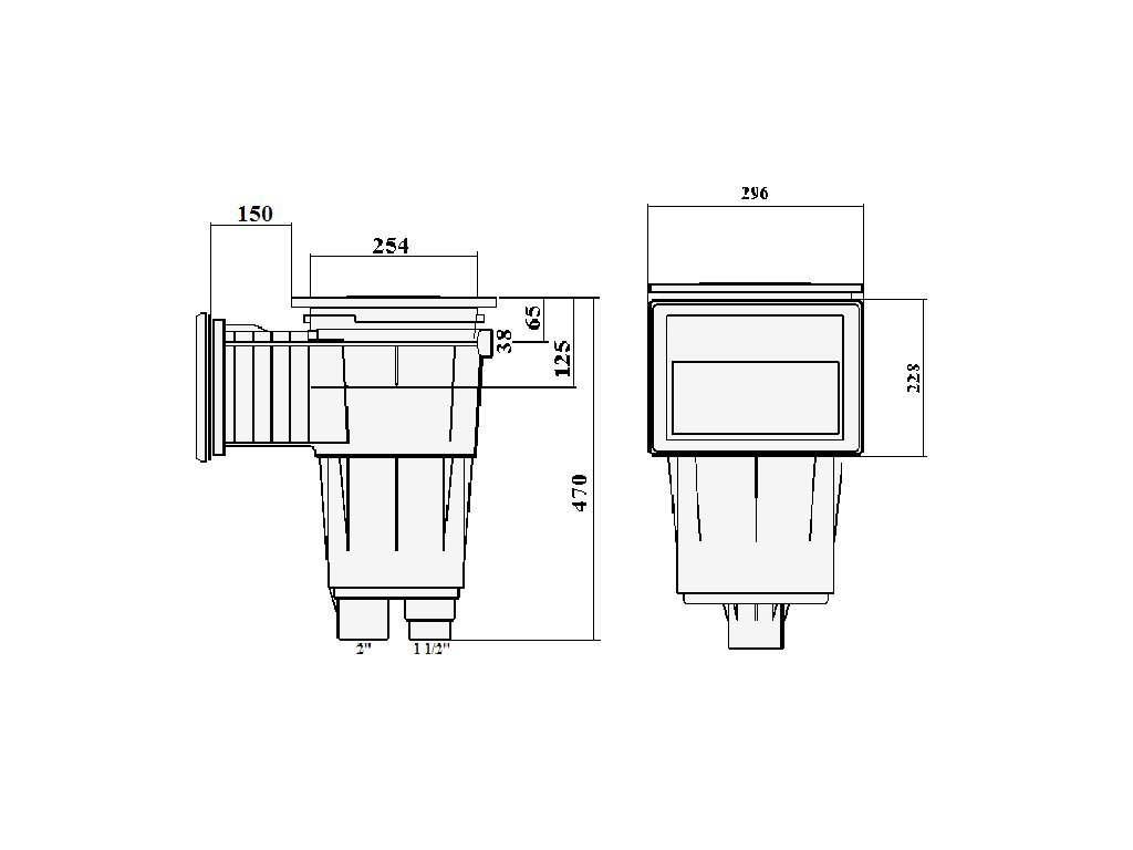 PŘIPOJENÍ SÁNÍ SKIMMERU : vnitřní závit 1 1/2“ nebo 2“ ŠÍŘKA HRDLA : 210 mm