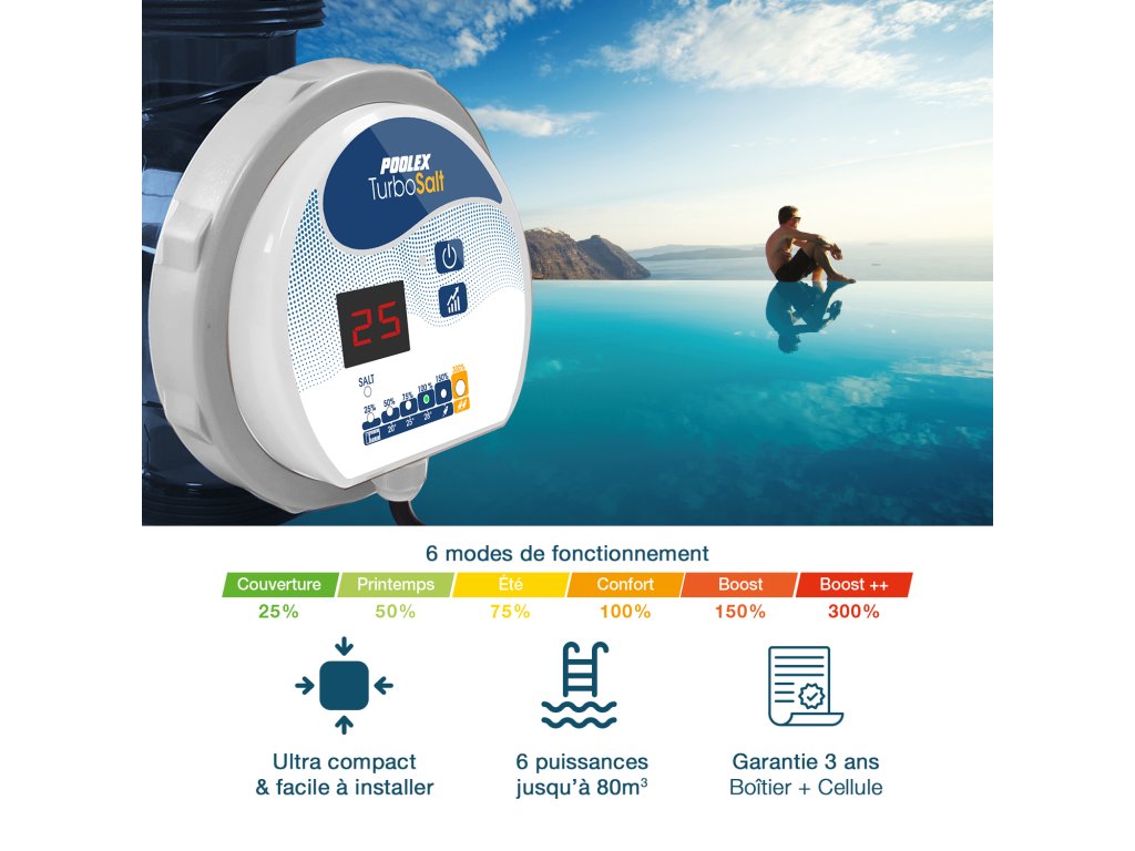 Dostupné pro bazény do 60m3. Turbo Salt je dodáván s připojením 50 mm (1' 1/2) a adaptéry 32/38 mm. Díky jeho upevnění na stěnu nebo podlahu se tento elektrolyzér přizpůsobí všem typům filtrace a jeho ultra-kompaktní velikost umožňuje instalaci i v nejmenších technických místnostech.