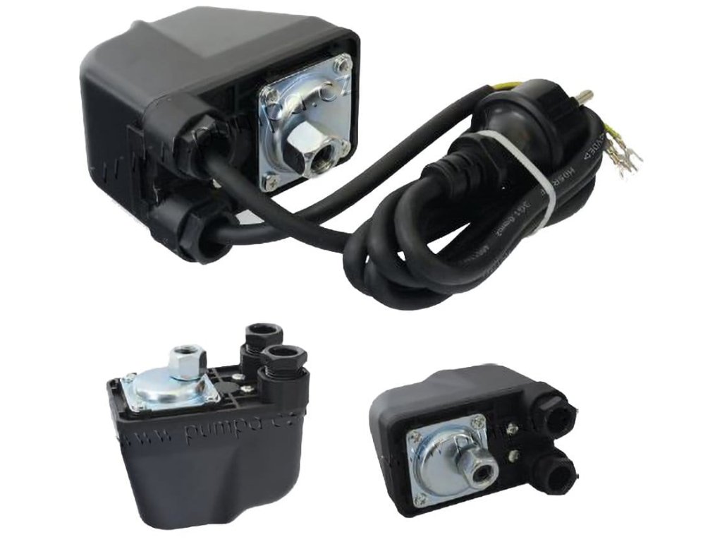 Tlakový spínač automaticky řídí chod čerpadla: při poklesu tlaku pod nastavenou hodnotu čerpadlo zapne, a při dosažení horní hranice tlaku jej vypne. Funguje na mechanickém principu on/off a zajišťuje tak spolehlivý a úsporný provoz čerpadla.